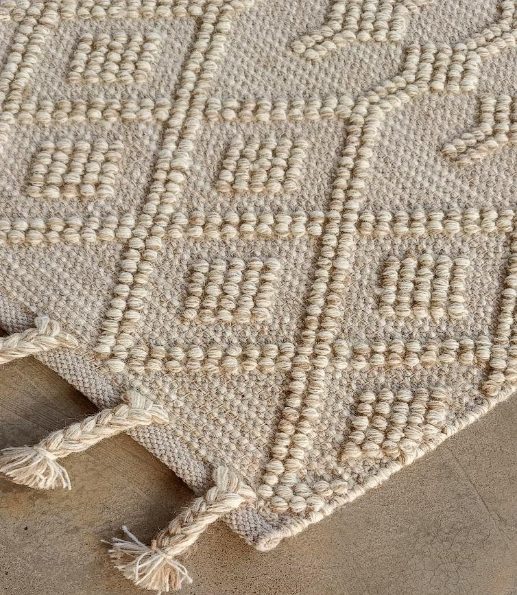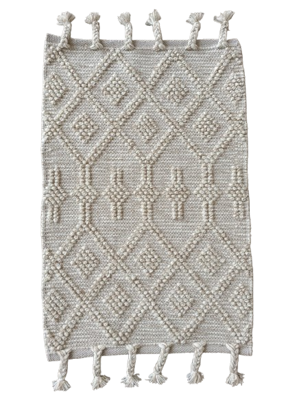 The Boho Diamond carpet blends artisanal charm with timeless elegance. Featuring an intricate raised diamond and geometric pattern in soft ivory and beige tones, this handwoven rug adds warmth and sophistication to any space. The decorative tasselled edges further enhance its bohemian appeal, making it a perfect statement piece for modern, rustic, or eclectic interiors.
