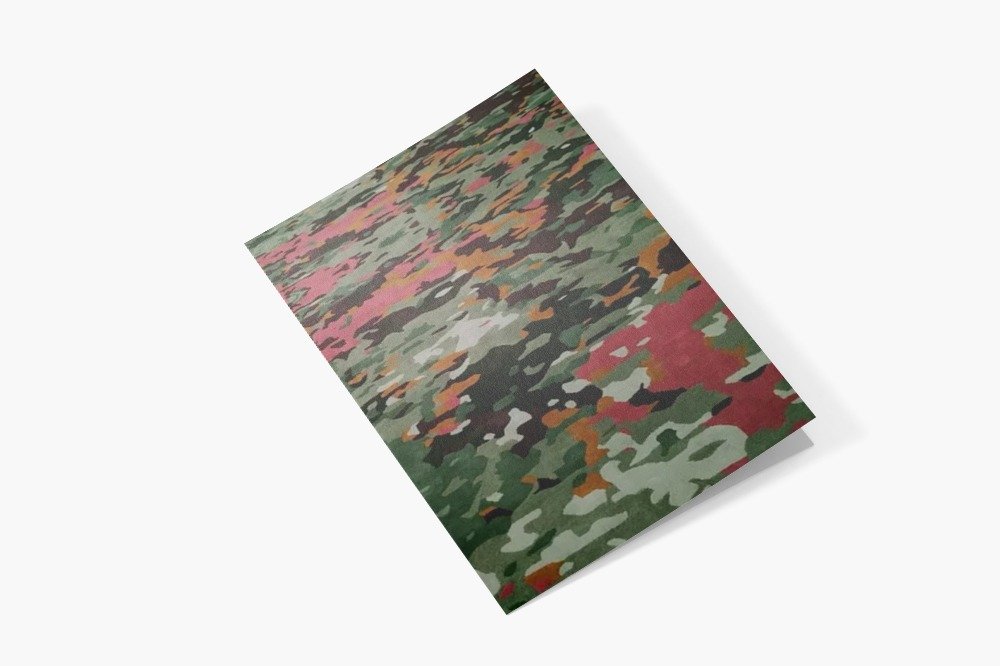 | Design | Camouflage-inspired pattern with shades of green, pink, orange, and black; dynamic design and lively color palette. |