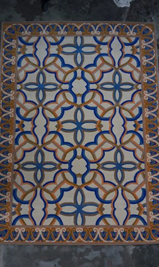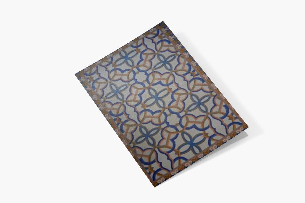 | Design | Intricate tilework-inspired pattern with a symmetrical layout in blue, gold, and beige tones. |