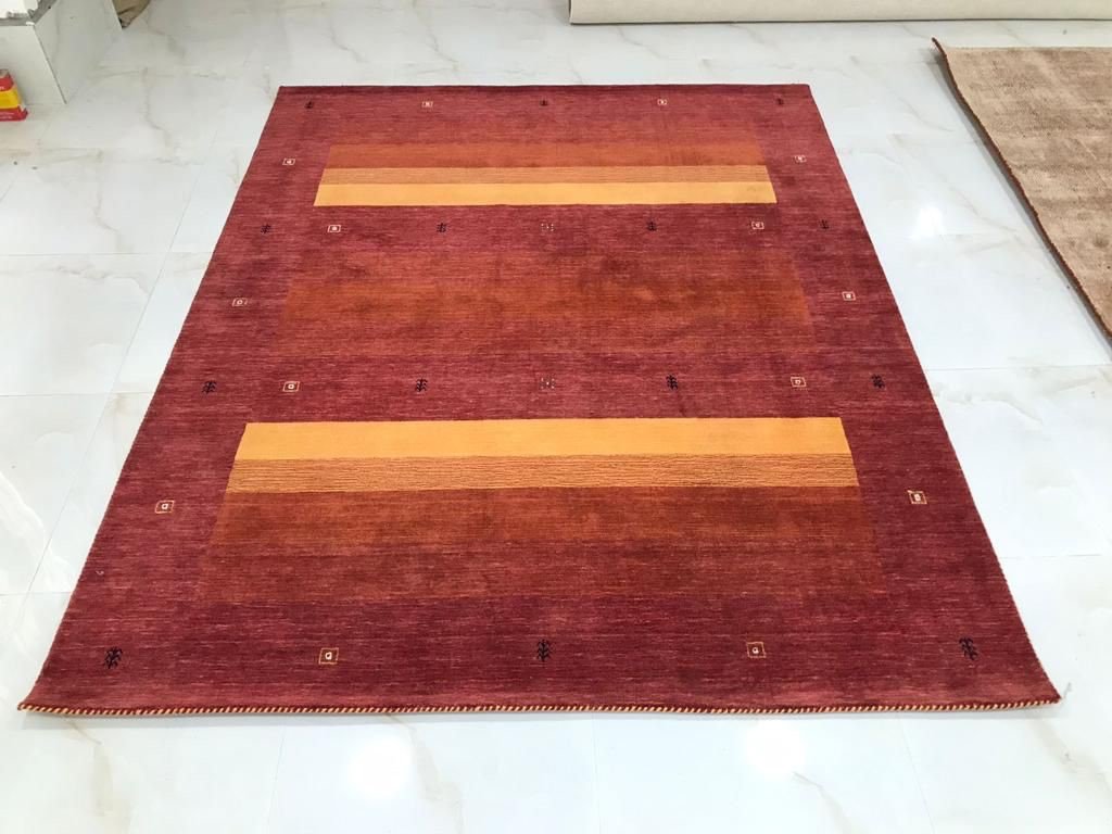The Royal Ember handloom carpet is a stunning blend of deep red and warm amber tones, evoking the rich hues of a glowing sunset. The minimalist pattern features bold horizontal golden stripes set against a deep crimson background, creating a luxurious and elegant aesthetic. Delicate tribal-inspired motifs add a subtle decorative touch, making it a perfect fusion of tradition and modernity.