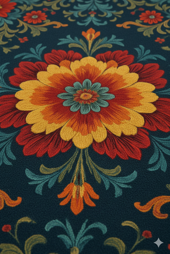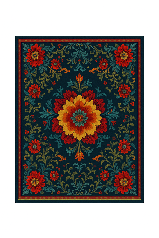 The Samarkand Bloom, or دنقرمس لگ (Gul-e Samarqand) in Persian, honors the Silk Road city famed for its gardens and artistry. Its central blossom symbolizes abundance, framed by motifs inspired by Samarkand’s timeless mosaics. Hand-tufted in bamboo silk and New Zealand wool, this piece pairs radiant sheen with durability, while deep midnight tones and accents of crimson, gold, and emerald bring refined elegance to any space.