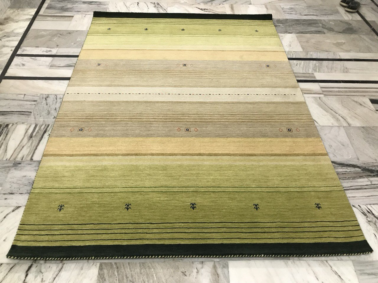 The Verdant Harmony handloom carpet is a beautiful fusion of earthy green, beige, and subtle golden hues, creating a natural and tranquil aesthetic. The delicate geometric motifs add a touch of artisanal charm, making it a perfect fit for both modern and traditional interiors.